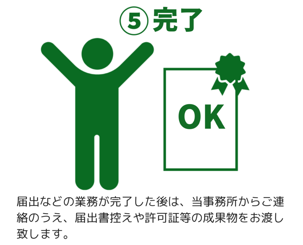 特別なケースを除き、ほとんどの手続きはオンラインで完了することができるため、これまでの手続きの7割以上でお客様にご来所いただくことや、反対にお客様の元へお伺いしてお時間をいただく様なことなく許可を取得しております。